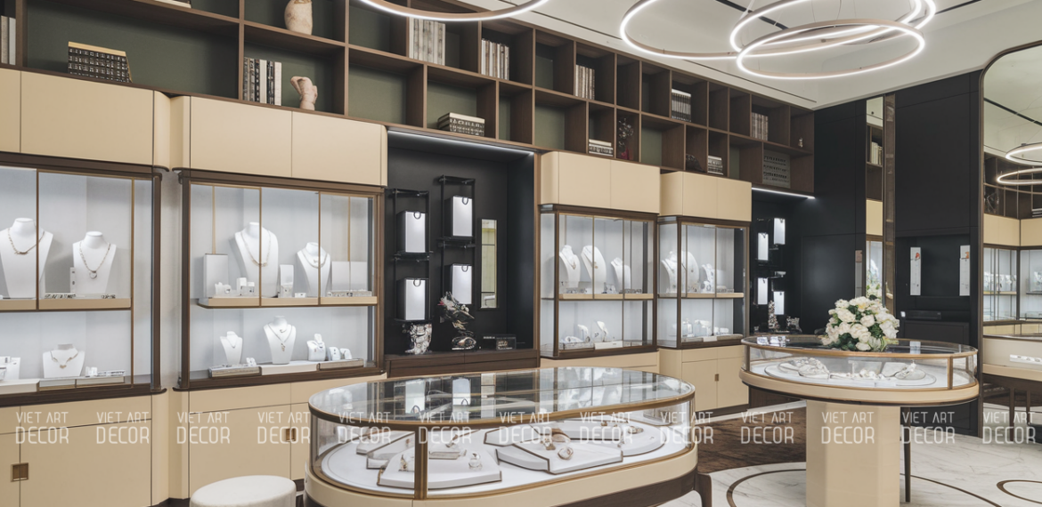 Thiết kế của cửa hàng trang sức này là một ví dụ điển hình cho thấy sự kết hợp hài hòa giữa tính thẩm mỹ và tính ứng dụng. Không gian sang trọng, tinh tế cùng với cách bố trí khoa học đã tạo nên một trải nghiệm mua sắm tuyệt vời cho khách hàng.
