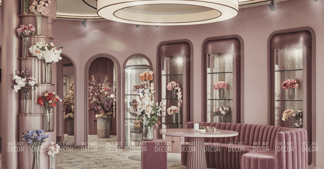 Màu sắc đóng vai trò quan trọng trong việc tạo nên không gian hấp dẫn cho shop hoa. Sử dụng các gam màu nhẹ nhàng như hồng pastel, tím nhạt kết hợp với trắng và vàng nhạt sẽ tạo cảm giác ấm cúng, tươi mới và thân thiện. Màu sắc nhẹ nhàng không chỉ giúp làm nổi bật màu sắc tự nhiên của hoa mà còn tạo sự hài hòa, thu hút ánh nhìn của khách hàng ngay từ cái nhìn đầu tiên.