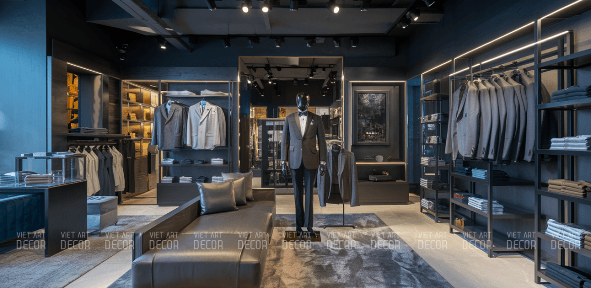 Cuối cùng, một khu vực sofa êm ái để khách hàng có thể ngồi đợi, trò chuyện hoặc thư giãn sẽ là điểm nhấn tuyệt vời cho cửa hàng. Đây không chỉ là nơi để chờ đợi, mà còn là không gian để kết nối và chia sẻ những câu chuyện về thời trang cho các quý ông.