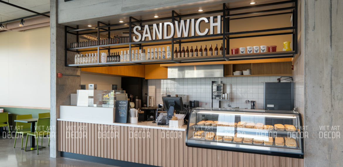 Thiết kế cửa hàng sandwich không chỉ là vấn đề về thẩm mỹ mà còn là một chiến lược kinh doanh. Một không gian tiện nghi, đẹp mắt, tối ưu hóa công năng sẽ không chỉ tạo ấn tượng mạnh mẽ với khách hàng mà còn giúp quy trình phục vụ trở nên chuyên nghiệp hơn, nâng cao hiệu suất làm việc. Dưới đây là những yếu tố cần lưu ý khi thiết kế cửa hàng sandwich sao cho tối ưu, từ lựa chọn vật liệu, ánh sáng, đến bố trí không gian và công năng của quầy phục vụ.